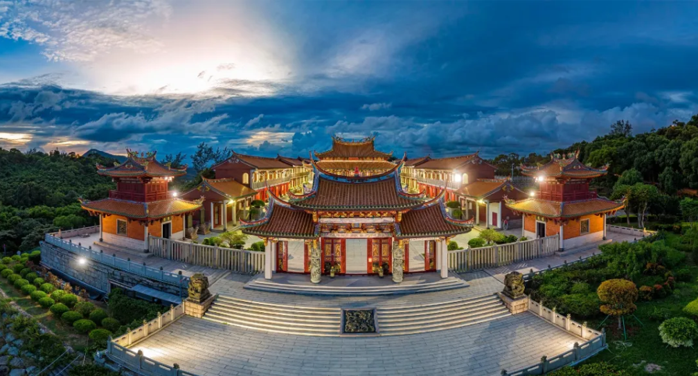 其建筑严格遵循闽南古制,参照福建、台湾妈祖庙传统布局,主体坐西朝东,由山门、钟鼓楼、祭坛、妈祖大殿及梳妆楼等组成,金色琉璃瓦顶与雕龙飞檐彰显恢弘气势。